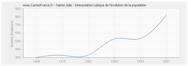 Cette courbe reprend l'historique de la population de Sainte-Julie de 1968 à 2007 en interpolation cubique. Ceci permet d'obtenir plus précisément la population de la commune de Sainte-Julie les années ou aucun recensement n'a été effectué.