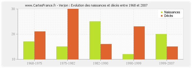 Verjon : évolution des naissances et décès de 1968 à 2007