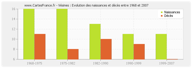 Vésines : évolution des naissances et décès de 1968 à 2007