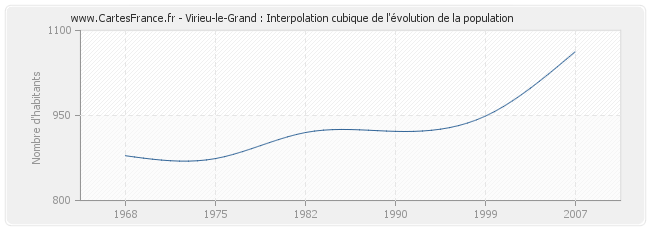 Cette courbe reprend l'historique de la population de Virieu-le-Grand de 1968 à 2007 en interpolation cubique. Ceci permet d'obtenir plus précisément la population de la commune de Virieu-le-Grand les années ou aucun recensement n'a été effectué.