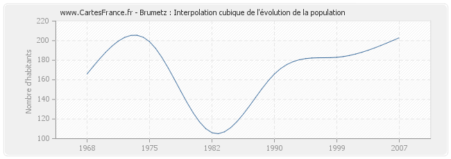 Cette courbe reprend l'historique de la population de Brumetz de 1968 à 2007 en interpolation cubique. Ceci permet d'obtenir plus précisément la population de la commune de Brumetz les années ou aucun recensement n'a été effectué.