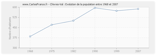 La population de Chivres-Val était de 588 habitants en 2007, 574 habitants en 1999, 596 habitants en 1990, 501 habitants en 1982, 471 habitants en 1975 et 385 habitants en 1968.