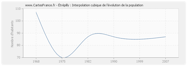 Cette courbe reprend l'historique de la population d'Étrépilly de 1968 à 2007 en interpolation cubique. Ceci permet d'obtenir plus précisément la population de la commune d'Étrépilly les années ou aucun recensement n'a été effectué.