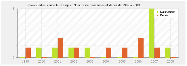 Lesges : évolution des naissances et décès de 1968 à 2007