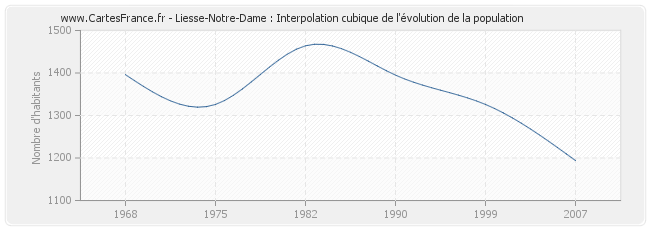 Cette courbe reprend l'historique de la population de Liesse-Notre-Dame de 1968 à 2007 en interpolation cubique. Ceci permet d'obtenir plus précisément la population de la commune de Liesse-Notre-Dame les années ou aucun recensement n'a été effectué.