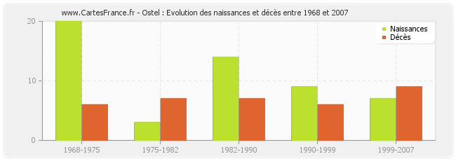Ostel : évolution des naissances et décès de 1968 à 2007