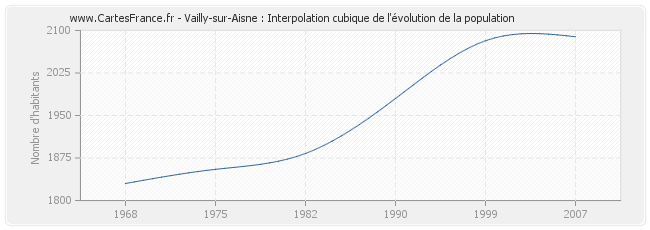 Cette courbe reprend l'historique de la population de Vailly-sur-Aisne de 1968 à 2007 en interpolation cubique. Ceci permet d'obtenir plus précisément la population de la commune de Vailly-sur-Aisne les années ou aucun recensement n'a été effectué.