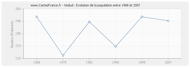 La population de Veslud était de 248 habitants en 2007, 252 habitants en 1999, 222 habitants en 1990, 247 habitants en 1982, 213 habitants en 1975 et 252 habitants en 1968.