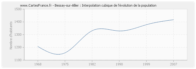 Cette courbe reprend l'historique de la population de Bessay-sur-Allier de 1968 à 2007 en interpolation cubique. Ceci permet d'obtenir plus précisément la population de la commune de Bessay-sur-Allier les années ou aucun recensement n'a été effectué.