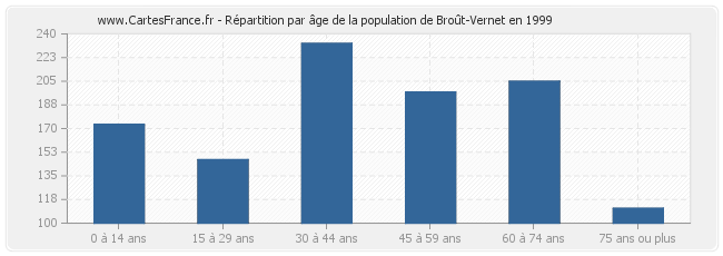 Répartition de la population de Broût-Vernet par âge en 1999 :