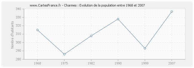 La population de Charmes était de 337 habitants en 2007, 293 habitants en 1999, 328 habitants en 1990, 308 habitants en 1982, 286 habitants en 1975 et 315 habitants en 1968.