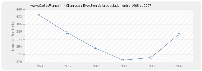 La population de Charroux était de 383 habitants en 2007, 330 habitants en 1999, 324 habitants en 1990, 352 habitants en 1982, 387 habitants en 1975 et 427 habitants en 1968.
