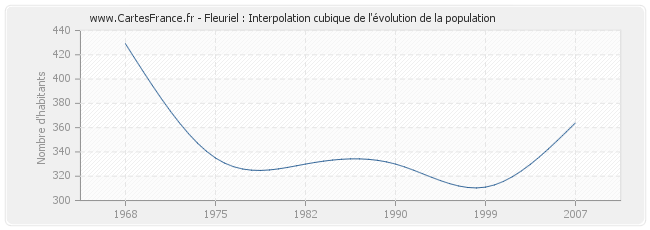 Cette courbe reprend l'historique de la population de Fleuriel de 1968 à 2007 en interpolation cubique. Ceci permet d'obtenir plus précisément la population de la commune de Fleuriel les années ou aucun recensement n'a été effectué.