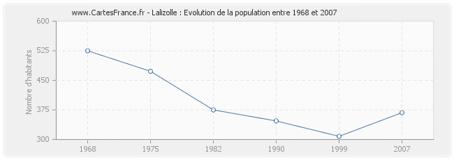 La population de Lalizolle était de 368 habitants en 2007, 308 habitants en 1999, 347 habitants en 1990, 375 habitants en 1982, 473 habitants en 1975 et 525 habitants en 1968.