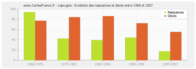 Laprugne : évolution des naissances et décès de 1968 à 2007