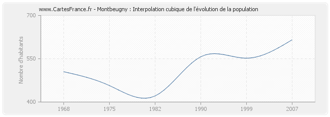 Cette courbe reprend l'historique de la population de Montbeugny de 1968 à 2007 en interpolation cubique. Ceci permet d'obtenir plus précisément la population de la commune de Montbeugny les années ou aucun recensement n'a été effectué.