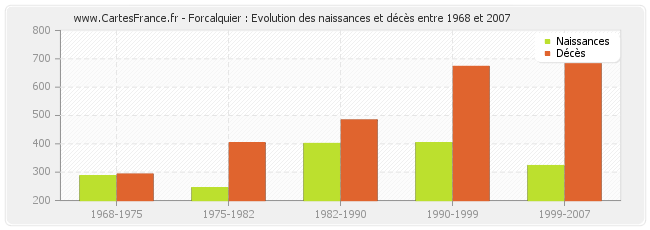 Forcalquier : évolution des naissances et décès de 1968 à 2007