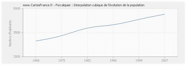Cette courbe reprend l'historique de la population de Forcalquier de 1968 à 2007 en interpolation cubique. Ceci permet d'obtenir plus précisément la population de la commune de Forcalquier les années ou aucun recensement n'a été effectué.