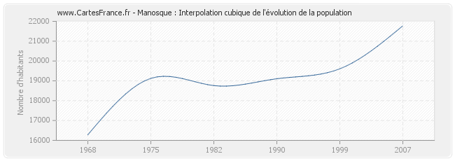 Cette courbe reprend l'historique de la population de Manosque de 1968 à 2007 en interpolation cubique. Ceci permet d'obtenir plus précisément la population de la commune de Manosque les années ou aucun recensement n'a été effectué.