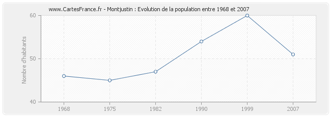 La population de Montjustin était de 51 habitants en 2007, 60 habitants en 1999, 54 habitants en 1990, 47 habitants en 1982, 45 habitants en 1975 et 46 habitants en 1968.