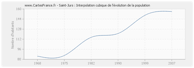 Cette courbe reprend l'historique de la population de Saint-Jurs de 1968 à 2007 en interpolation cubique. Ceci permet d'obtenir plus précisément la population de la commune de Saint-Jurs les années ou aucun recensement n'a été effectué.