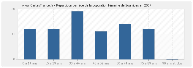 Répartition de la population féminine de Sourribes par âge en 2007 :