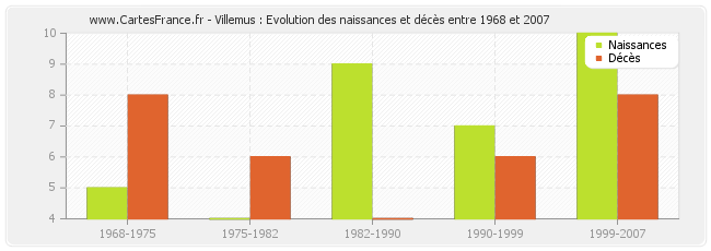 Villemus : évolution des naissances et décès de 1968 à 2007