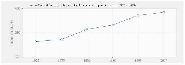 La population d'Abriès était de 377 habitants en 2007, 358 habitants en 1999, 297 habitants en 1990, 271 habitants en 1982, 207 habitants en 1975 et 195 habitants en 1968.
