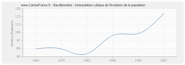 Cette courbe reprend l'historique de la population de Barcillonnette de 1968 à 2007 en interpolation cubique. Ceci permet d'obtenir plus précisément la population de la commune de Barcillonnette les années ou aucun recensement n'a été effectué.