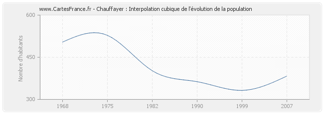 Cette courbe reprend l'historique de la population de Chauffayer de 1968 à 2007 en interpolation cubique. Ceci permet d'obtenir plus précisément la population de la commune de Chauffayer les années ou aucun recensement n'a été effectué.