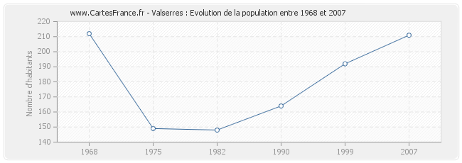 La population de Valserres était de 211 habitants en 2007, 192 habitants en 1999, 164 habitants en 1990, 148 habitants en 1982, 149 habitants en 1975 et 212 habitants en 1968.