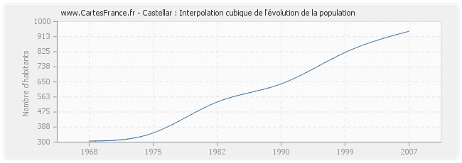 Cette courbe reprend l'historique de la population de Castellar de 1968 à 2007 en interpolation cubique. Ceci permet d'obtenir plus précisément la population de la commune de Castellar les années ou aucun recensement n'a été effectué.