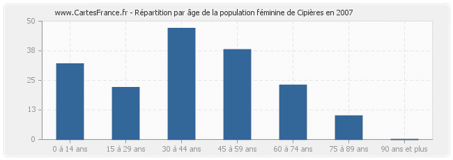 Répartition de la population féminine de Cipières par âge en 2007 :