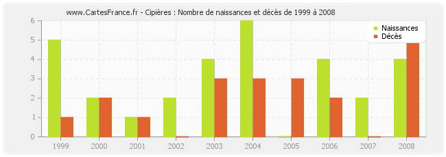 Cipières : évolution des naissances et décès de 1968 à 2007