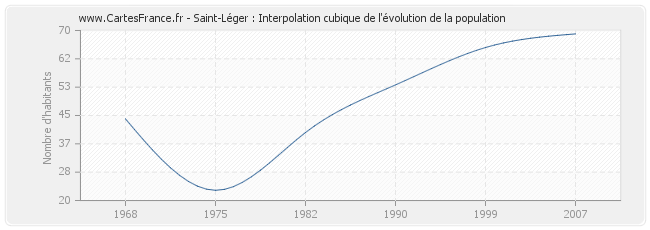 Cette courbe reprend l'historique de la population de Saint-Léger de 1968 à 2007 en interpolation cubique. Ceci permet d'obtenir plus précisément la population de la commune de Saint-Léger les années ou aucun recensement n'a été effectué.