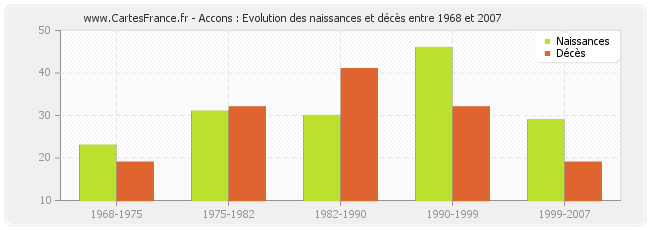 La population d'Accons était de 432 habitants en 2007, 418 habitants en 1999, 375 habitants en 1990, 378 habitants en 1982, 289 habitants en 1975 et 277 habitants en 1968.