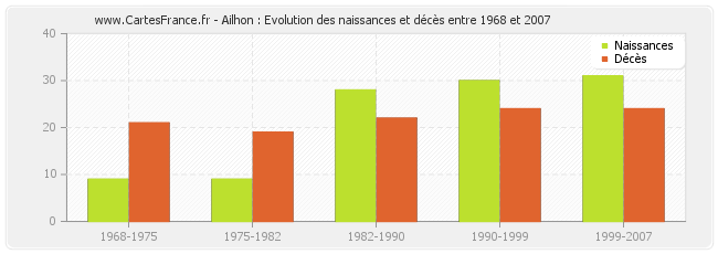 Ailhon : évolution des naissances et décès de 1968 à 2007