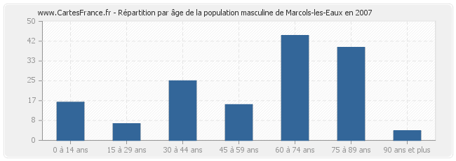 Répartition de la population masculine de Marcols-les-Eaux par âge en 2007 :