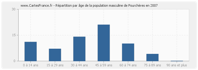 Répartition de la population masculine de Pourchères par âge en 2007 :