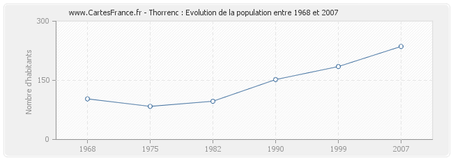 La population de Thorrenc était de 236 habitants en 2007, 185 habitants en 1999, 152 habitants en 1990, 97 habitants en 1982, 84 habitants en 1975 et 103 habitants en 1968.