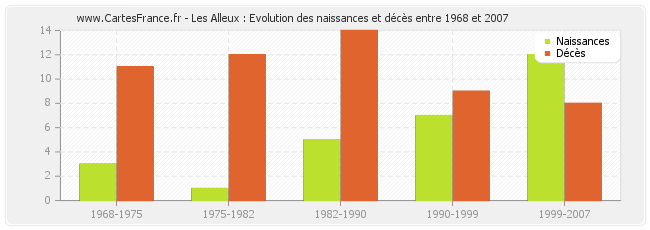 Les Alleux : évolution des naissances et décès de 1968 à 2007