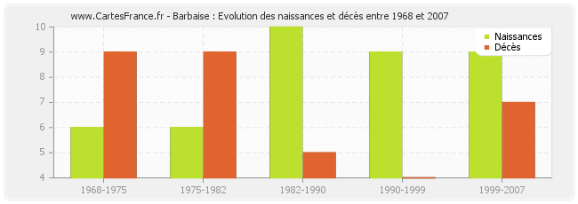 Barbaise : évolution des naissances et décès de 1968 à 2007