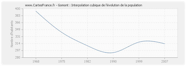 Cette courbe reprend l'historique de la population de Gomont de 1968 à 2007 en interpolation cubique. Ceci permet d'obtenir plus précisément la population de la commune de Gomont les années ou aucun recensement n'a été effectué.