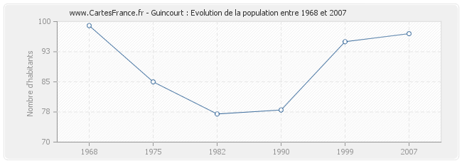 La population de Guincourt était de 97 habitants en 2007, 95 habitants en 1999, 78 habitants en 1990, 77 habitants en 1982, 85 habitants en 1975 et 99 habitants en 1968.
