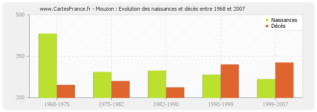 Mouzon : évolution des naissances et décès de 1968 à 2007