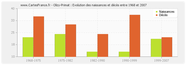 Olizy-Primat : évolution des naissances et décès de 1968 à 2007