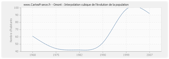 Cette courbe reprend l'historique de la population d'Omont de 1968 à 2007 en interpolation cubique. Ceci permet d'obtenir plus précisément la population de la commune d'Omont les années ou aucun recensement n'a été effectué.