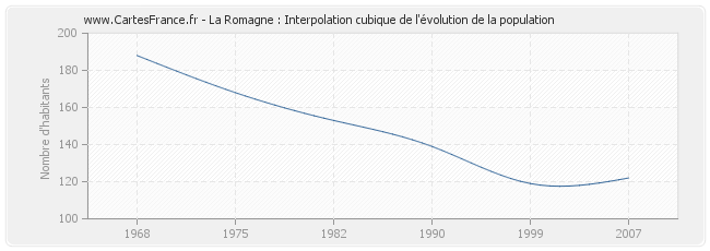 Cette courbe reprend l'historique de la population de La Romagne de 1968 à 2007 en interpolation cubique. Ceci permet d'obtenir plus précisément la population de la commune de La Romagne les années ou aucun recensement n'a été effectué.