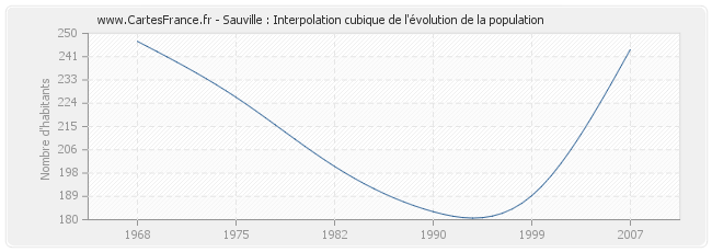 Cette courbe reprend l'historique de la population de Sauville de 1968 à 2007 en interpolation cubique. Ceci permet d'obtenir plus précisément la population de la commune de Sauville les années ou aucun recensement n'a été effectué.