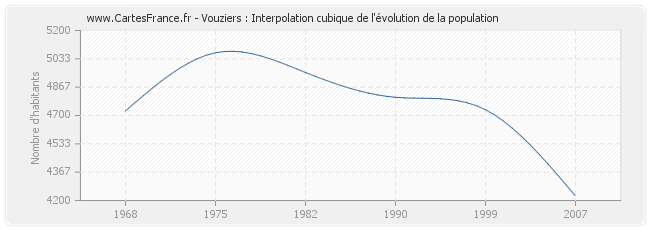 Cette courbe reprend l'historique de la population de Vouziers de 1968 à 2007 en interpolation cubique. Ceci permet d'obtenir plus précisément la population de la commune de Vouziers les années ou aucun recensement n'a été effectué.